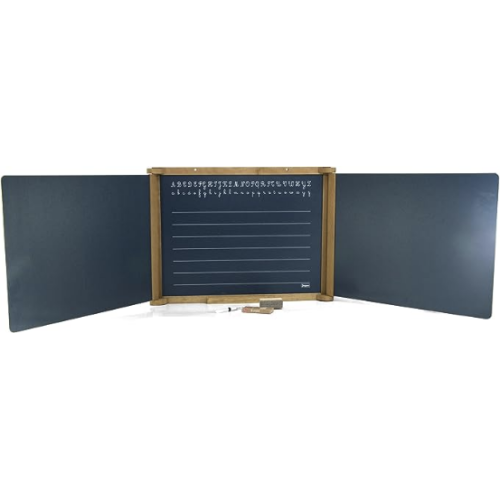 Comme à l'école : Tableau Tryptique en Bois teinté chêne Une ardoise centrale et deux volets pour feutre effaçable à sec et craie Dimension du produit ouvert : 156 x 43 cm, dimension du produit fermé : 56 x 43 cm Age minimum : 3 ans Fabrication Française Fonctionne sans pile